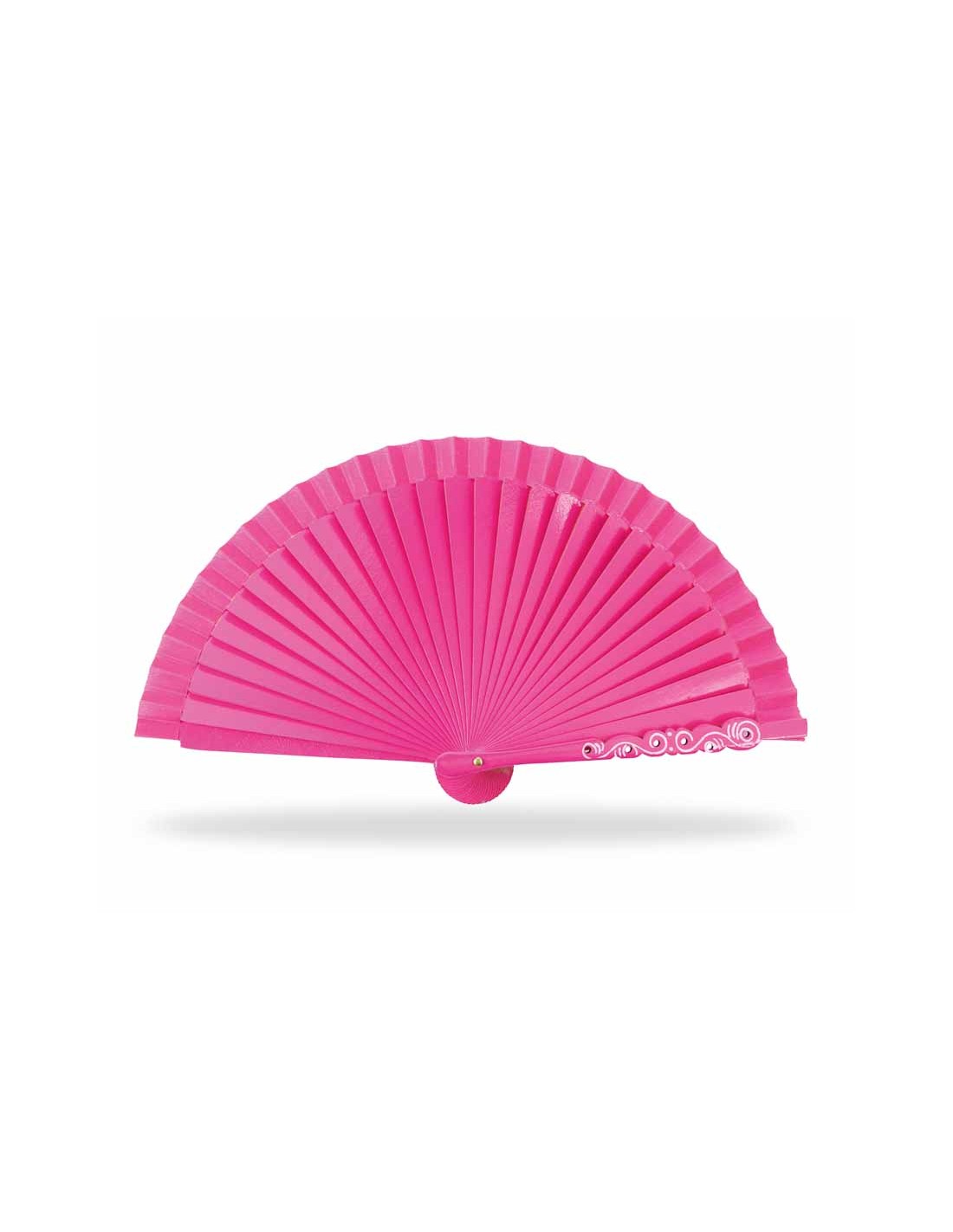 Abanico de madera liso, en color fucsia, con detalle calado y decorado en una de las varillas guarda.