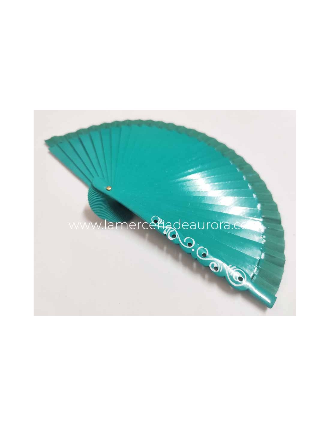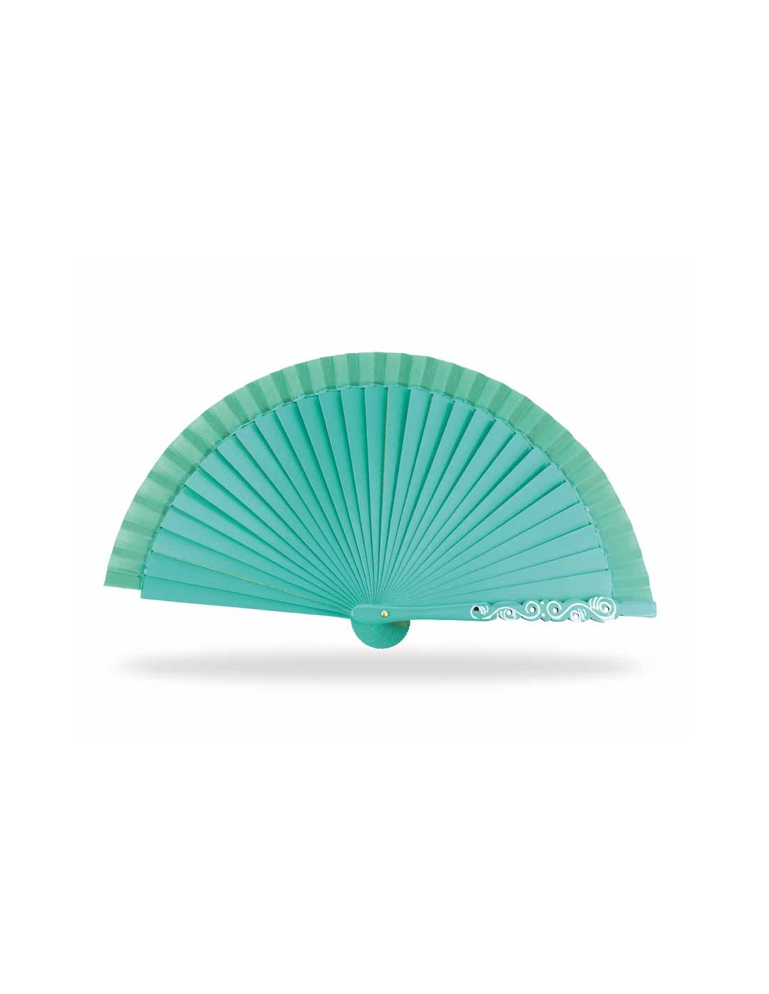 Abanico de madera liso, en color verde esmeralda, con detalle calado y decorado en una de las varillas guarda.